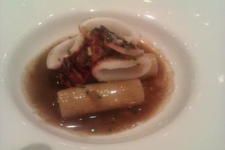 - Guiso de calamar de potera con pasta y manitas: recomendación especial del maitre (de uno de ellos, no era plan de hacer el feo). 5 anillas de calamar hermosas (medio calamar, calculo), pasado por la plancha y remozado de un caldo bien gelificado y cuatro (si, cuatro, dos por barba) macarrones rellenos de la farsa de manitas. Rico el calamar (buen genero y bien tratado), y el guiso en general, pero con una acusadísima falta de potencia; ¿saben cuando el respeto al producto se convierte en remilgo? pues multipliquen esa sensación por cuatro e igual se acercarán. Buena idea, buena ejecución y poca sal = 5.