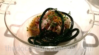 No tiene perdón el perdérselo. Comenzamos con un aperitivo de Champagne LANSON (8) Black Label Brut de Reims. Para ello degustamos las etéreas tortillitas de camarones (9,5), cuan pan de gusanitos y el temaki de anguila (7). Buena cantidad de espumas en la copa. La vida vuelve con un pan de gamba, guacamole, cilantro y maracuya en el top (7). Demasiados sabores juntos. El ñoqui aparece con una perfecta presentación y buenísimo sabor a batata confitada (9), lleva además manzana y cereza marinados. Después y como último aperitivo, siguiendo con burbujas ya catalanas (Gramona Imperial, Raventós i Blanc Rosé y Tatiana elaborado con Parxa blanca) degustamos el esférico, no de fútbol, sino de cerdo y plátano, crujiente y con preciosa presentación zen, palillo incluido (9,5).