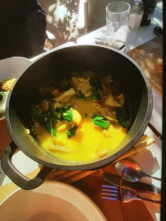 - Arroz en caldero con almejas y vierias: Preparado en cazuela Le Creuset que se deja en la mesa para servirnos nosotros mismos. Excelente el fondo de pescado y el punto del arroz. Raciones más que abundantes (ha sobrado) con muchas almejas y una única vieria por persona. Grande, eso sí.