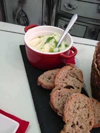 confirmo ahora despues de haber comido alli las acertadas valoraciones de kopicki.hoy el menu era;la clasica y fresca ensalada de mezclum de lechugas y frutos secos con naranja,buena;humus con crudites de verduras,bueno;steak tartare con mahonesa de mango y curry,estaba en su punto de todo,bueno;dos albondigas de pavo con una salsa de manzana deliciosas,buenas y tambien un arroz con espinacas,costillas de cerdo