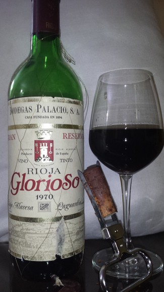 Hoy abrimos un vino con 45 años a sus espaldas. Se trata de un Glorioso gran reserva de 1.970 producido por Bodegas Palacios en Laguardia. Estos son los vinos que esperamos con ansia en estos países de Dios. Abrimos la botella muy cuidadosamente con el abridor de lamas y conseguimos, no sin esfuerzo, que el corcho saliese de una pieza, bastante húmedo por cierto. Lo dejamos airearse hora y cuarto previa a la cata y lo servimos a 18°C.