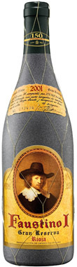 Uvas : tempranillo 85 % - graciano 10 % - mazuelo 5 %. Faustino I Gran Reserva pertenece a una serie de botellas decorativas ( vieja estampa riojana, retrato de Rembrandt, cristal opaco, etc. ) llamadas " añadas míticas " y que ahora cuestan un ojo de la cara. Ésta contiene un vino de color rojo atejado, envejecido y cansado, que huele a guinda en licor pero sabe a madera vieja : se está borrando una imagen del clasicismo.
