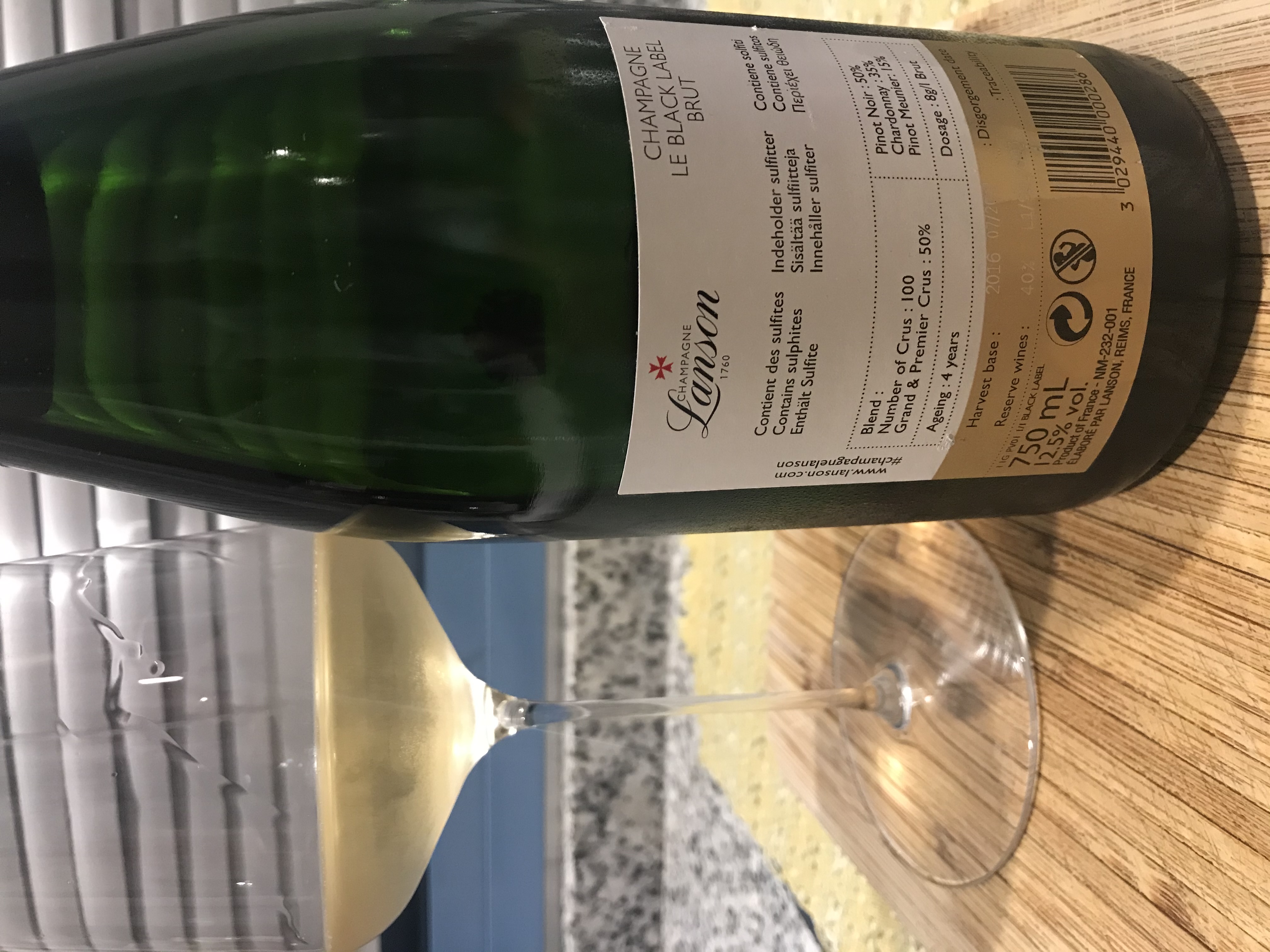 El champagne Lanson Black Label Brut es de un color amarillo pálido, límpido y su carbónico es delicado y sutil.