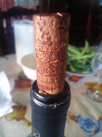 Corcho que sale impecable y entero con sacacorchos de dos tiempos. Muy bañado en vino y que huele muy bien por el interior.