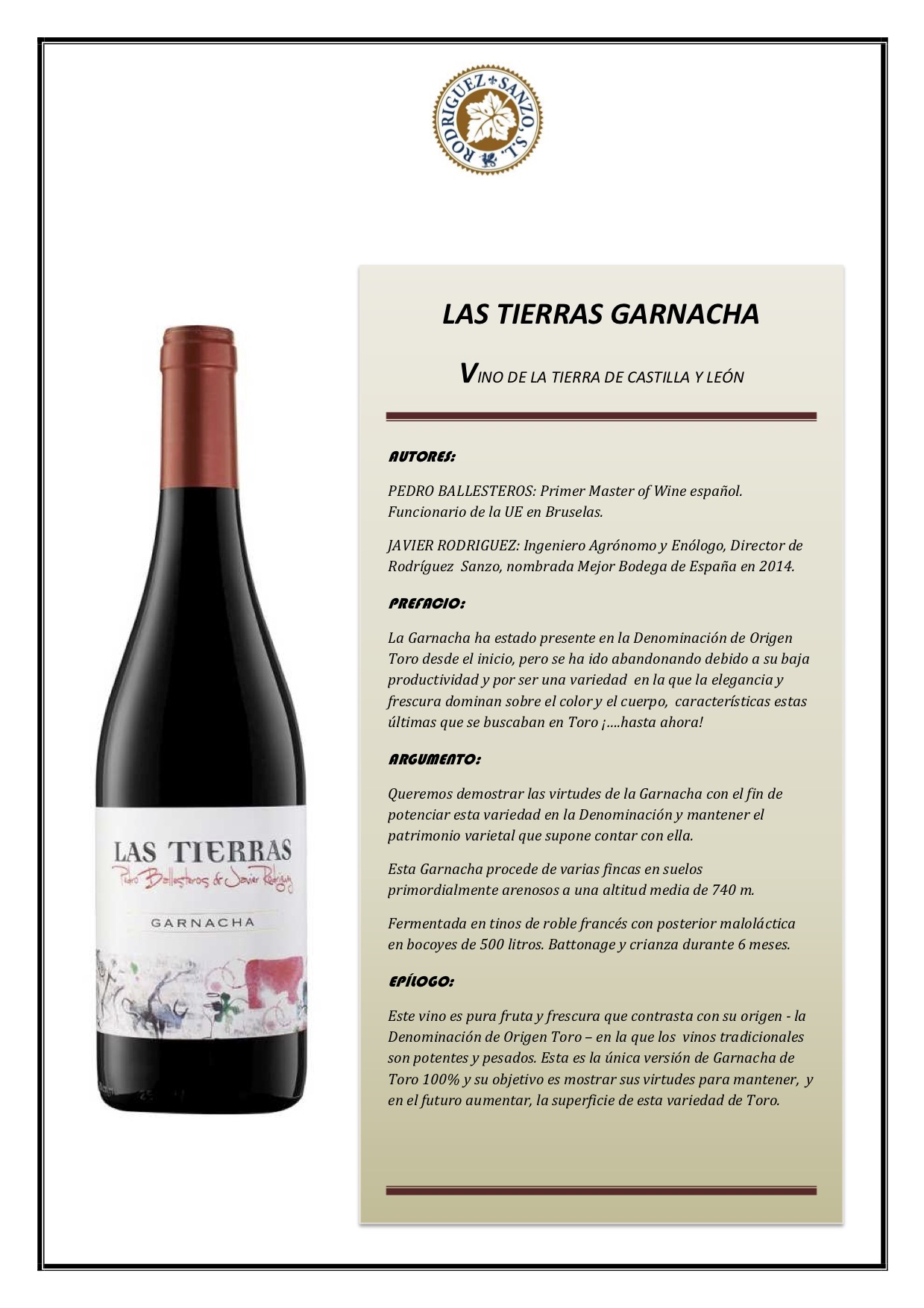 Ahora si que estamos ante un vino varietal, completa uva Garnacha de Toro. Fruta, alcohol, licores de fruta y taninos gustosos. Equilibrio con acidez y alcohol, con taninos firmes y muy largo en aromas y sabores complejos primarios y algún terciario de botella. La madera está integrada, con taninos potentes y algo verdes, quizá por raspón.