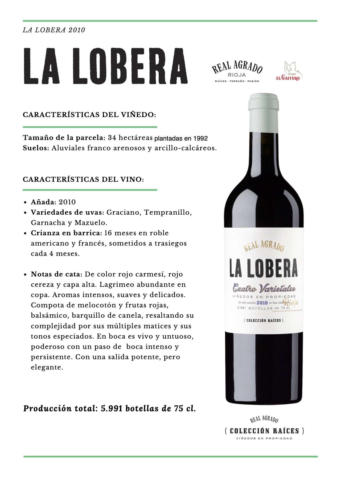 Vino maduro, de corte clásico y moderno por la extracción que tiene, los taninos que aportan vida, pues notamos juventud en el vino al ser un 2010.
