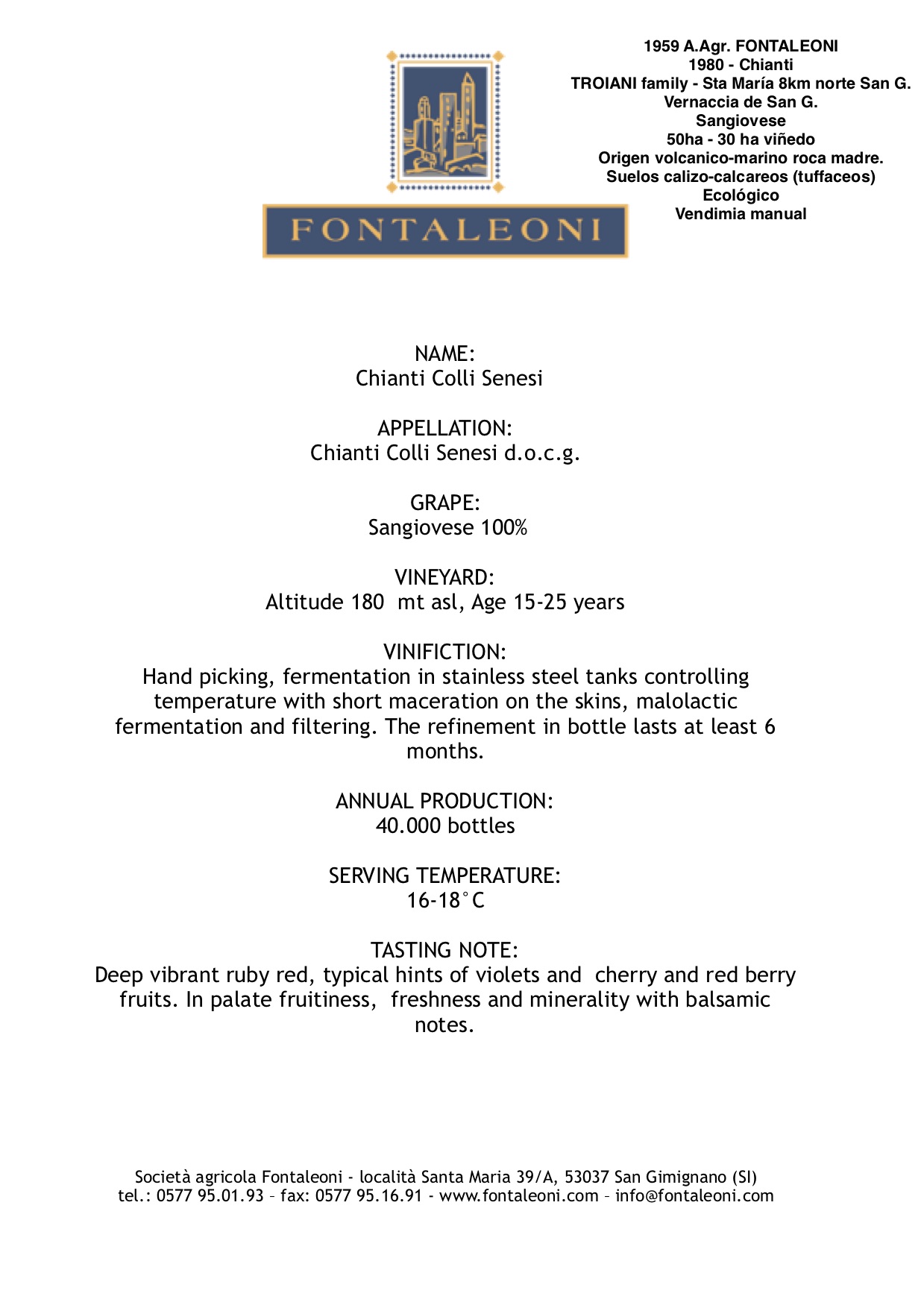 Vino tinto sin pretensiones, bien equilibrado, frutado y agradable en el paso del paladar. Deja recuerdos afrontados rojos y alguna nota de licores de guindas. Los taninos son medidos y la acidez bien alta equilibrada con alcohol y cuerpo medios, sin ser gran potencia, no vislumbra complejidad pero es un fiel concepto del Chianti Toscano, con un final de fruta y terroir.