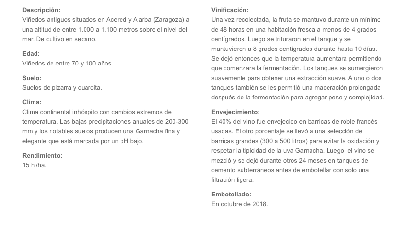 No creo que tenga mucha vida por delante, esta muy evolucionado , en su aspecto , en nariz y en boca. En cualquier caso , ahora su poderío es brutal. Muy especiado , casi picante, se aparta de las garnachas de la zona. Punzante, algo agresivo en boca ,, no por su tanicidad, por su estímulo gustativo. Algún aroma de retención y de de licorosidad incipiente. Para beber ya , y disfrutarlo