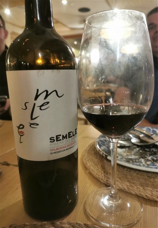 MARIDAJE: Nos pedimos varios platos al centro. Dos tablitas de quesos variados, dos de jamón ibérico de bellota, y también dos calamares plancha sobre mousse de all-i-oli y tallarines en su tinta. Con el jamón fue un espectáculo pues las notas grasas y cárnicas del ibérico maridaron fantásticamente con los apuntes tostaditos y licorosos de nuestro riberita. Delicioso todo... vino, comida y velada.