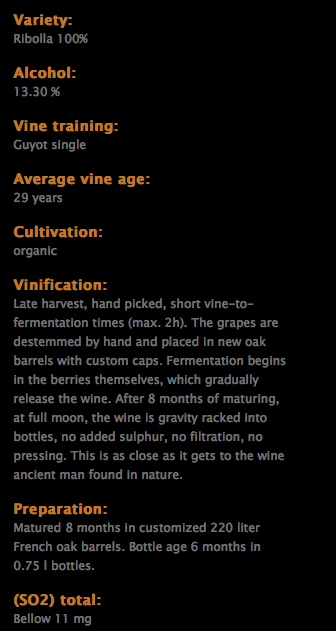 Seco con acidez media+, alcohol medio, pieles y una intensidad media+ con notas de pera Williams, lima, vainilla, notas de arcilla-barro y almendras amargas. Cuerpo medio+, denso en boca.