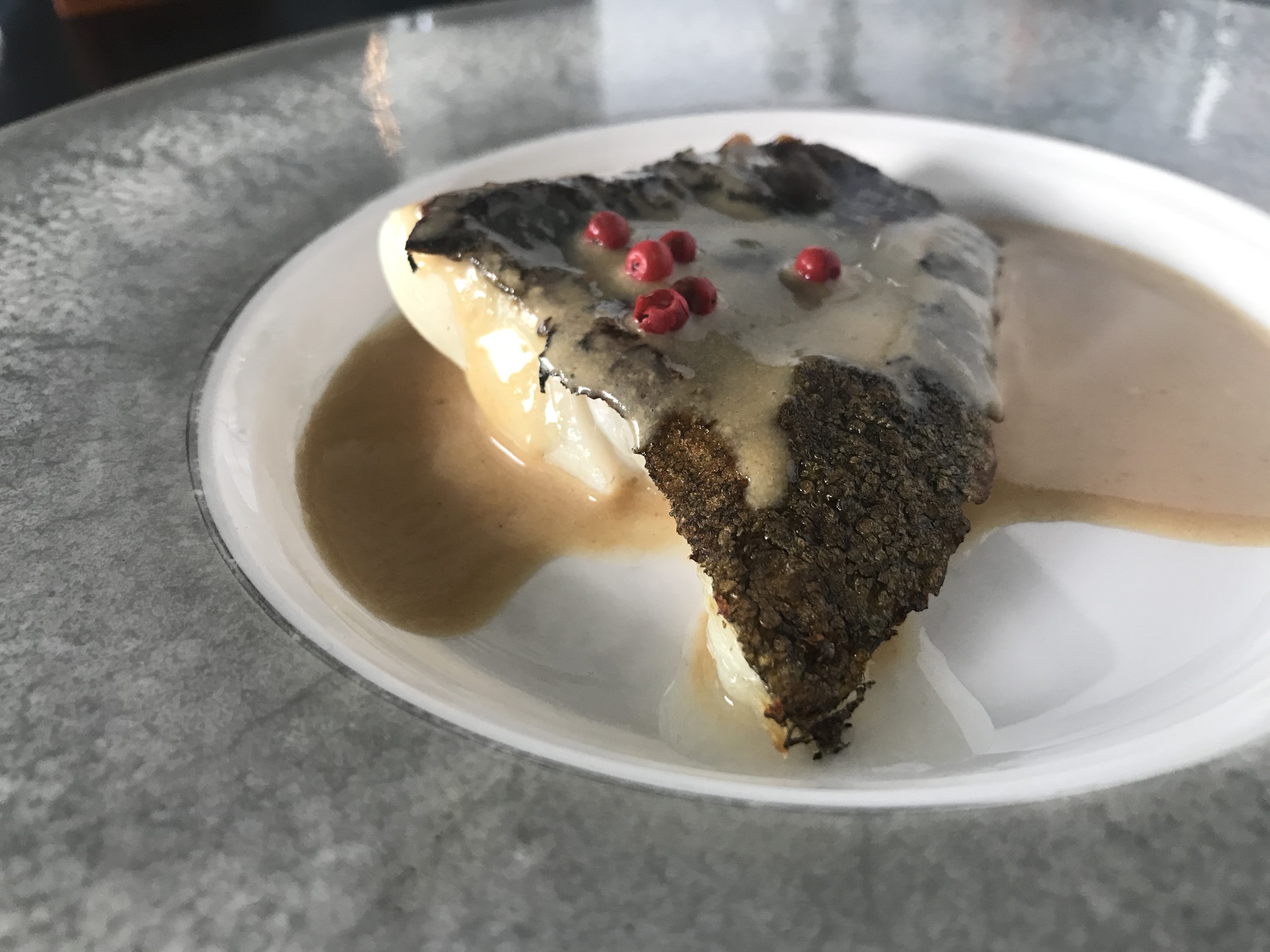 Palodú menu degustación con Barolo, en este caso Rodaballo a la pimienta rosa y Nebbiolo de Ceretto 2016, magnífica combinación ad hoc.