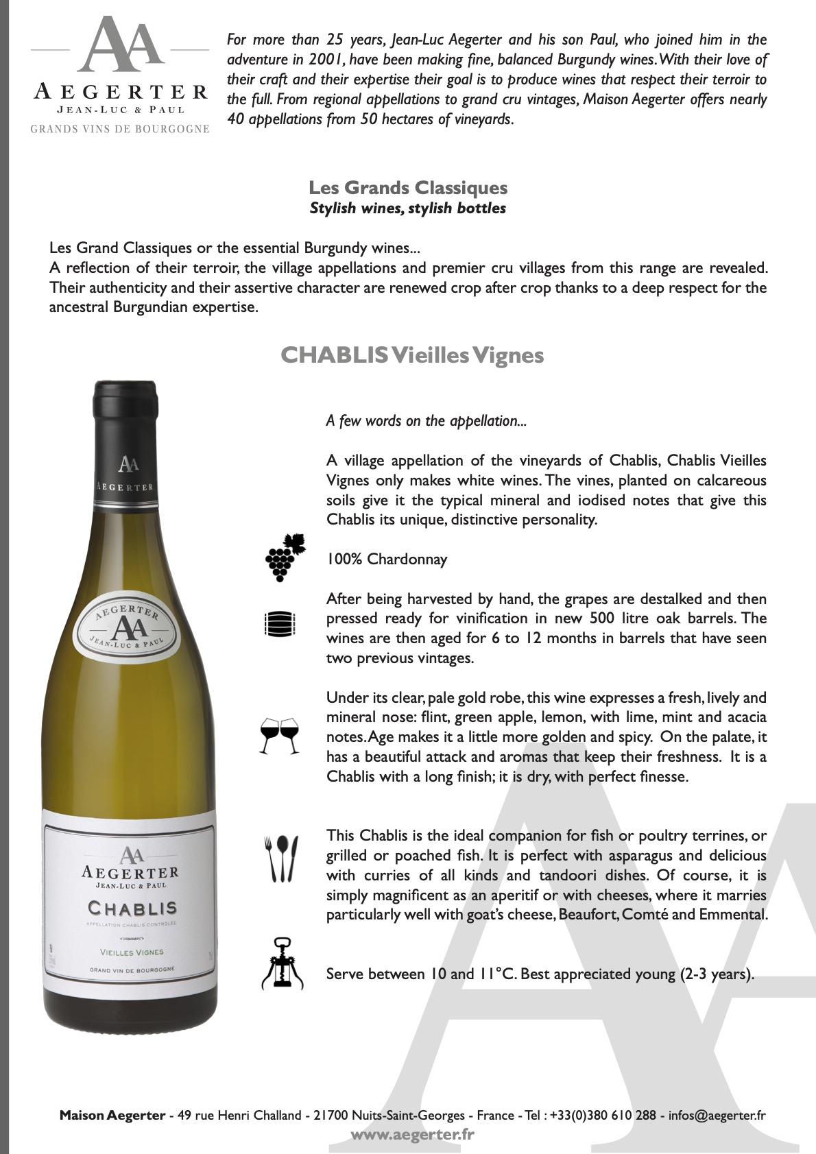 Chablis de libro, bien integrado, untuoso, humo, mineral, fino equilibrio, con acidez media+ y notas de miel y fruta madura, con alguna especia como vainilla y clavo y eso que es barrica de 2 usos. Dejo la ficha técnica de la web.