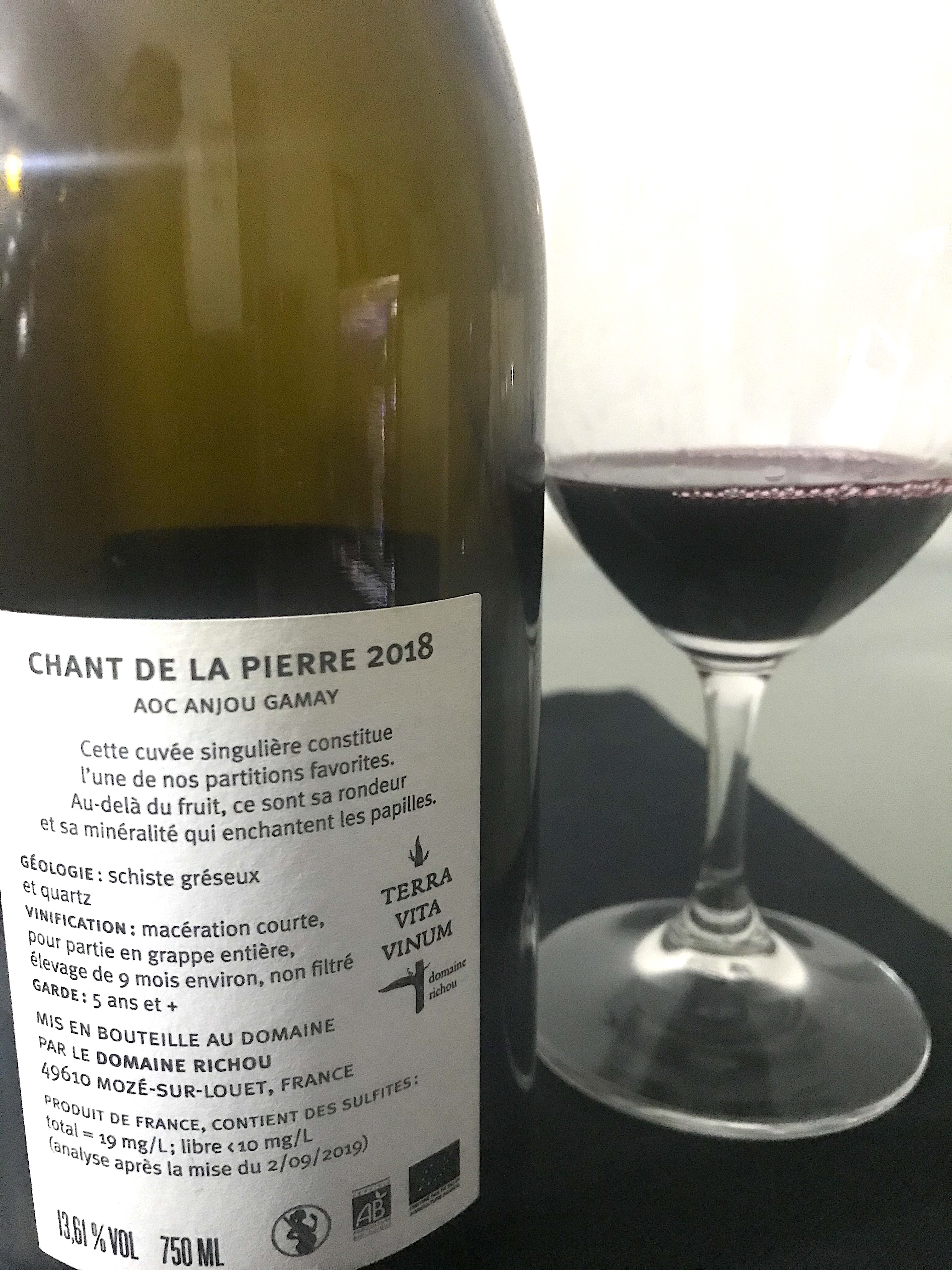 Vino tinto del Loira, fresco y con estilo Beaujolais, pero más frescor, incluso como un cru. Cápsula de cera, en el convertirse a biológicos y biodinámicas en la región más extensa y prolija de Francia. Suelos de esquistos y cuarzo, semi-maceración carbónica y 9 meses ad hoc en inbox, sin casi SO2. Estos vinos me gustan mucho.
