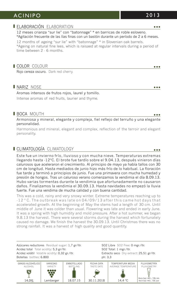 Seco, con acidez media+, alcohol alto. Taninos medios, con notas herbáceas de té, cacao, madera, tabaco y bosque. Mora negra, cereza negra. Final medio+ con intensidad media plus y medio cuerpo.