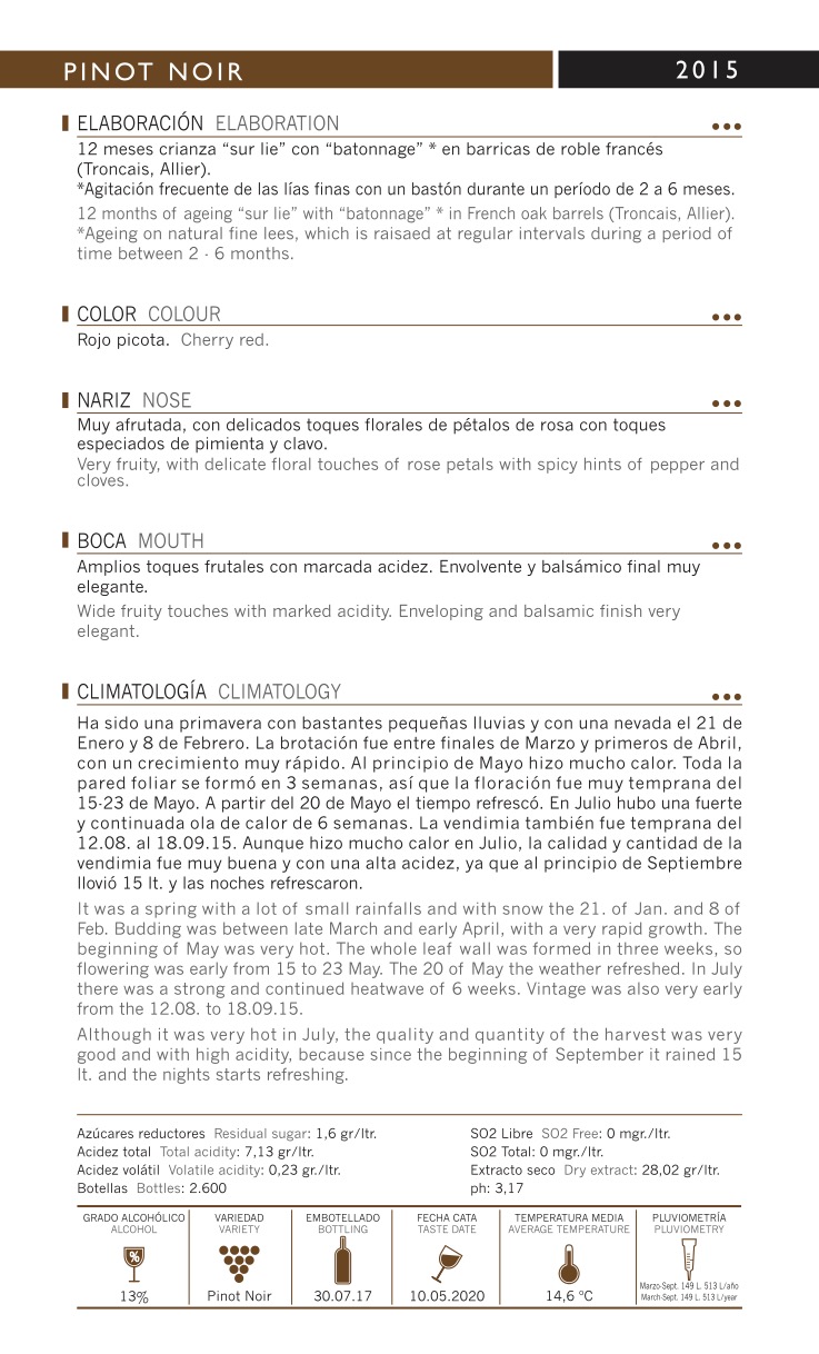 Acidez medio+, seco, con taninos medios jugosos y frescos, con mucha calidad de fruta roja ( cereza, fresa), menta poleo, eucalipto, hierbabuena, pimienta, ciruela regaliz de palo. Cuerpo medio. Final medio+ con intensidad medio+.