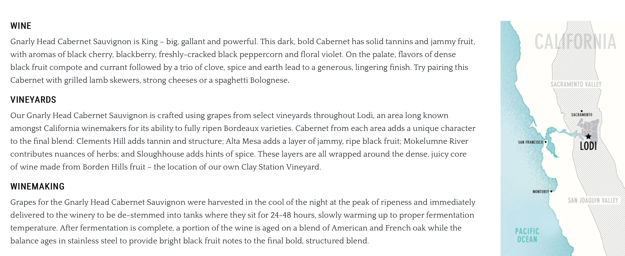 Vino para copear, disfrutar con carne. Son sabores con frutos negros, pimienta, clavo, regaliz y madera tostada. Hay notas de carbón vegetal, denso en boca, con cuerpo medio y taninos medios. Casi seco y acidez media, sin excesiva extracción.