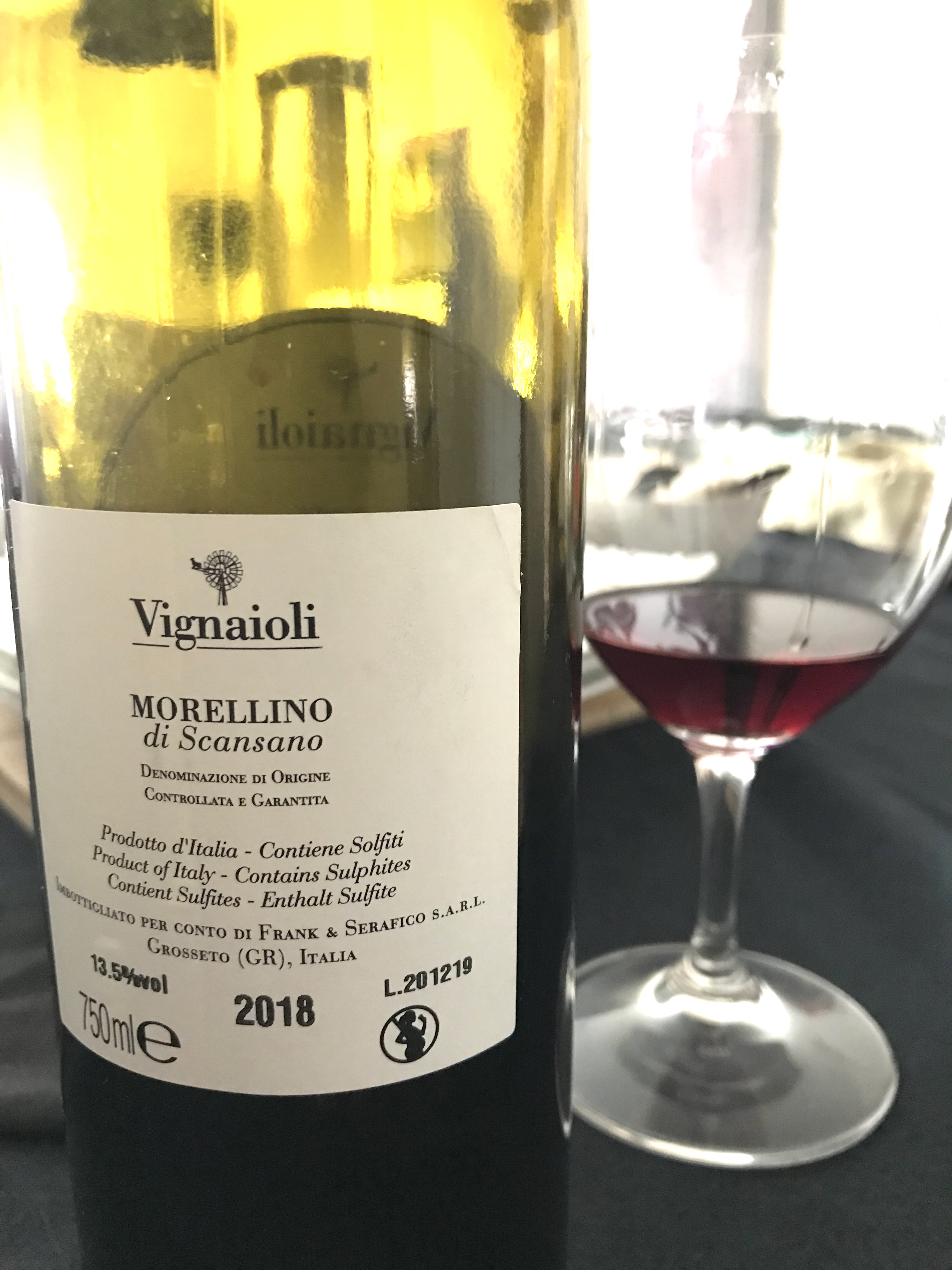 Morellino di Scansano básico, con madera afinada y muy varietal, con notas florales y fruta roja madura, alguna nota de kirsch y cereza roja. Miel de campo, violetas, tierra. acidez media+, alcohol alto, cuerpo medio, intensidad media y final medio de fruta madura ( cereza, ciruela, pasas). Ese corte italiano con un poco de casi seco ( parece que maduran algunas uvas más).