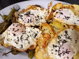 Maridó de maravilla con unos huevos fritos trufados con patatas fritas y pimientos.
