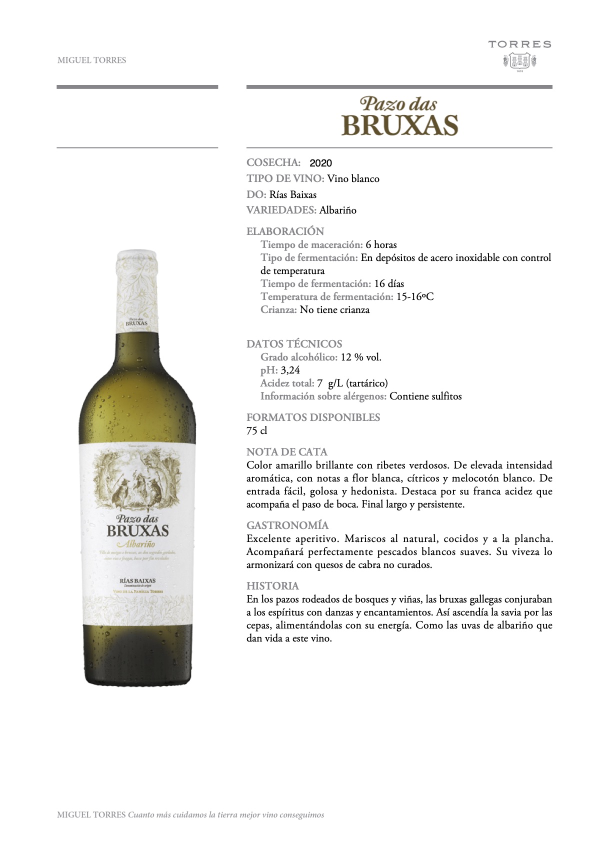 Pazo das Bruxas es un vino homenaje al folclore y la naturaleza de Galicia, tierra de grandes bosques habitados por seres místicos y mágicos. Entre ellos las brujas gallegas que habitaban en viejos pazos, donde conectaban con la naturaleza mediante danzas y encantamientos para obtener de ella su mejor fruto. Como las cepas de albariño que dan vida a Pazo das Bruxas.