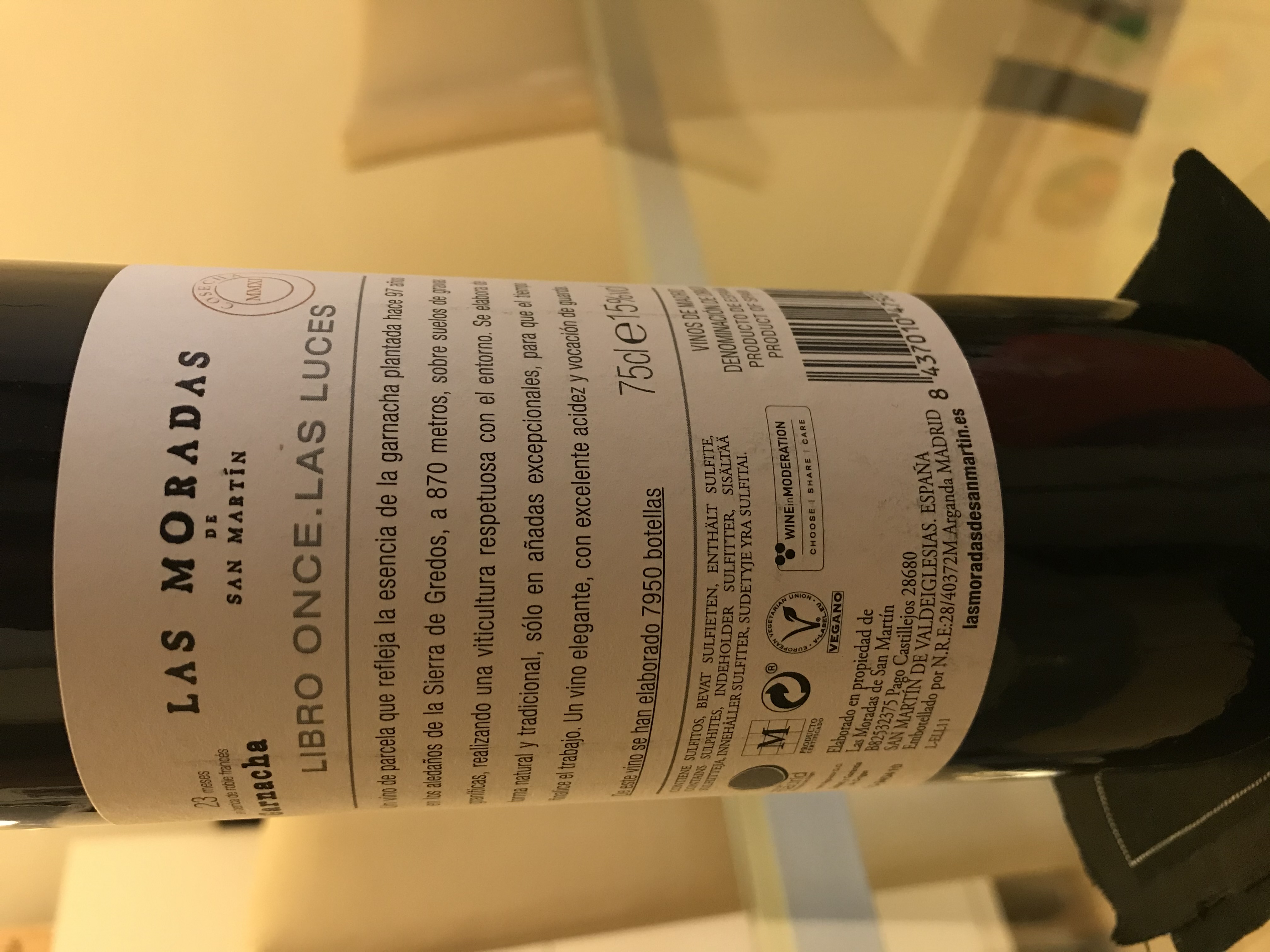 Seca, con acidez medio+, taninos medio+, alcohol alto, pero con gran equilibrio, intensidad pronunciada y final largo con cuerpo medio. Fruta negra en licor: arándano, ciruela, kirsch, mora, tomillo, matorral, pino, muy balsámico, piedra, jara. Es el monte de Madrid , la sierra.