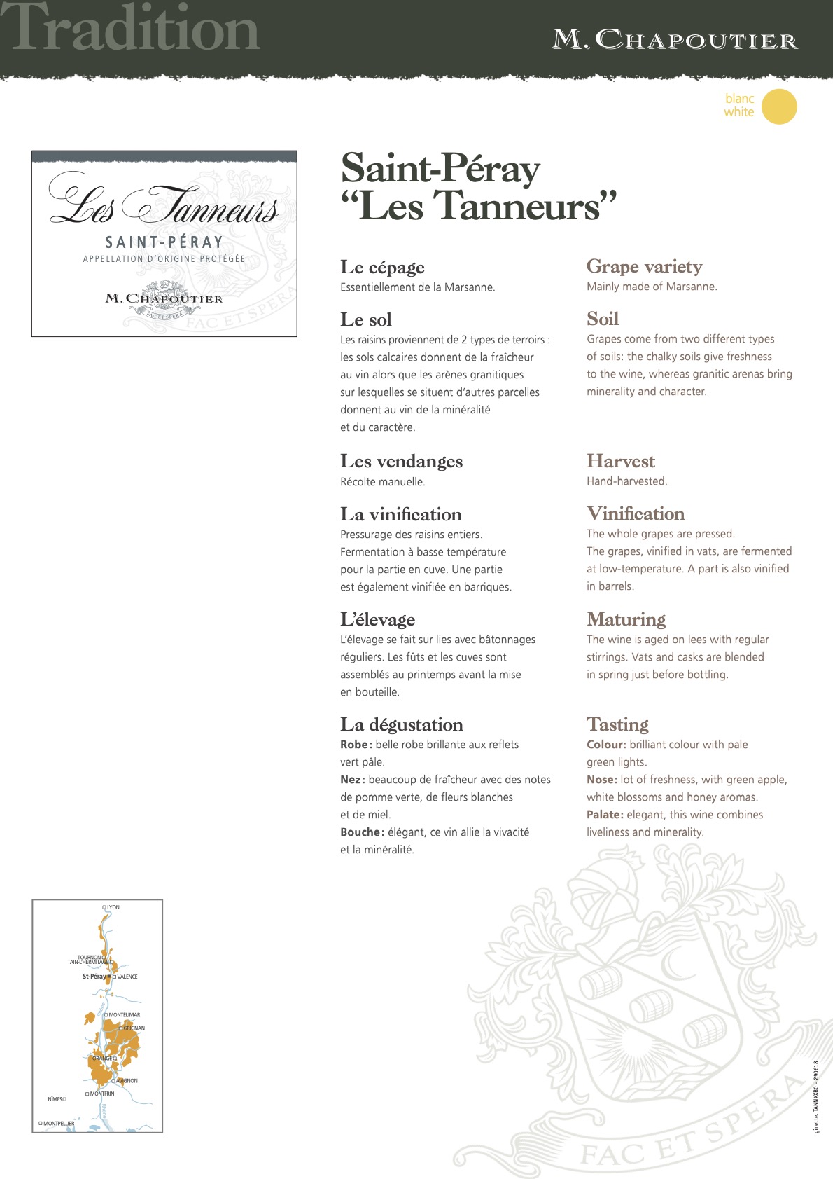 Vino noble de una de las variedades más jugosas del Ródano. Se vendimia en su punto justo de madurez, para obtener acidez y fruta fresca y madura ( limón, pera, membrillo, melocotón) con notas amilanas medio+ en fase olfativa. Muy limpio en aromas.