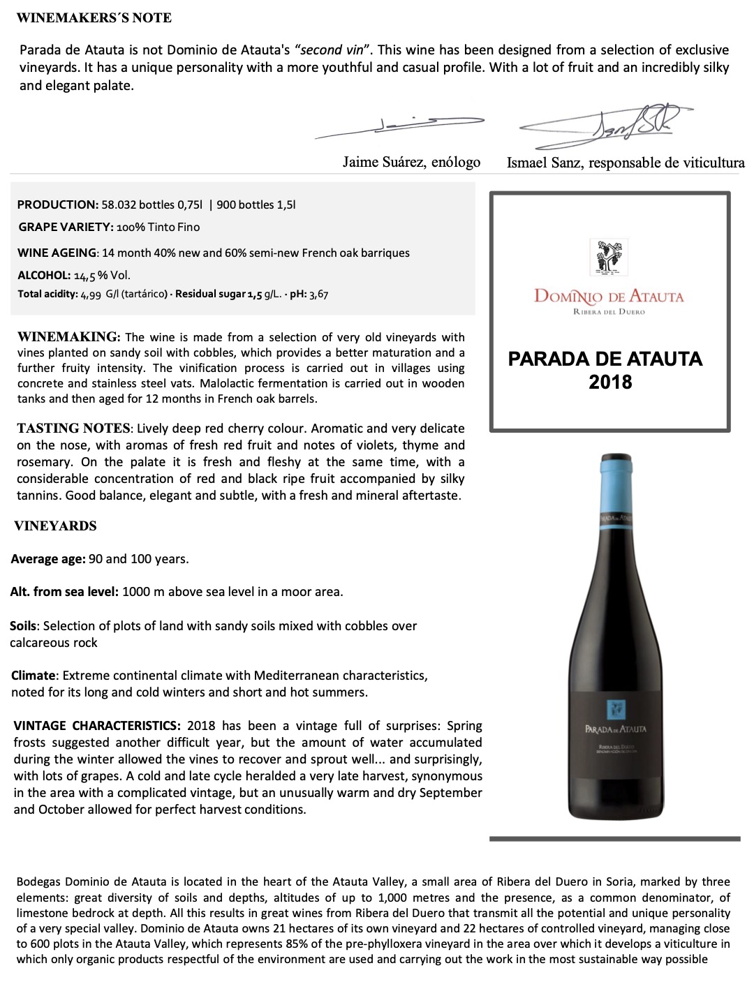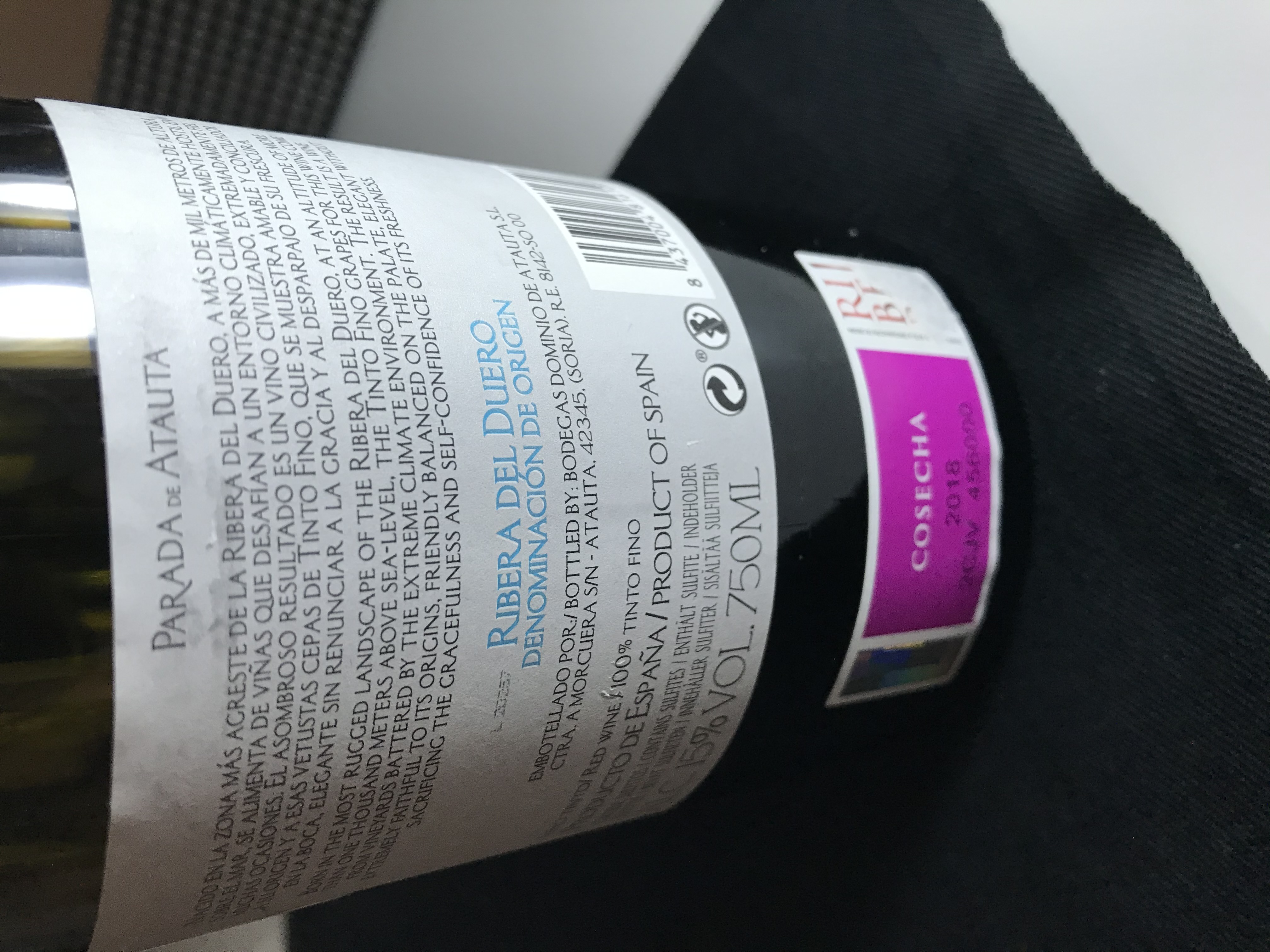 A la vista presenta un color rojo cereza picota con ribete morado, aromas de buena intensidad fruta negra y frutos del bosque mora, grosella, flores azules, especias como la vainilla, la canela, nuez moscada, pimienta negra, torrefactos, chocolate negro, balsámico en boca es un Ribera con cuerpo, buena acidez, tanino presente pero domándose, barrica de buena calidad, frutos del bosque, especiado.