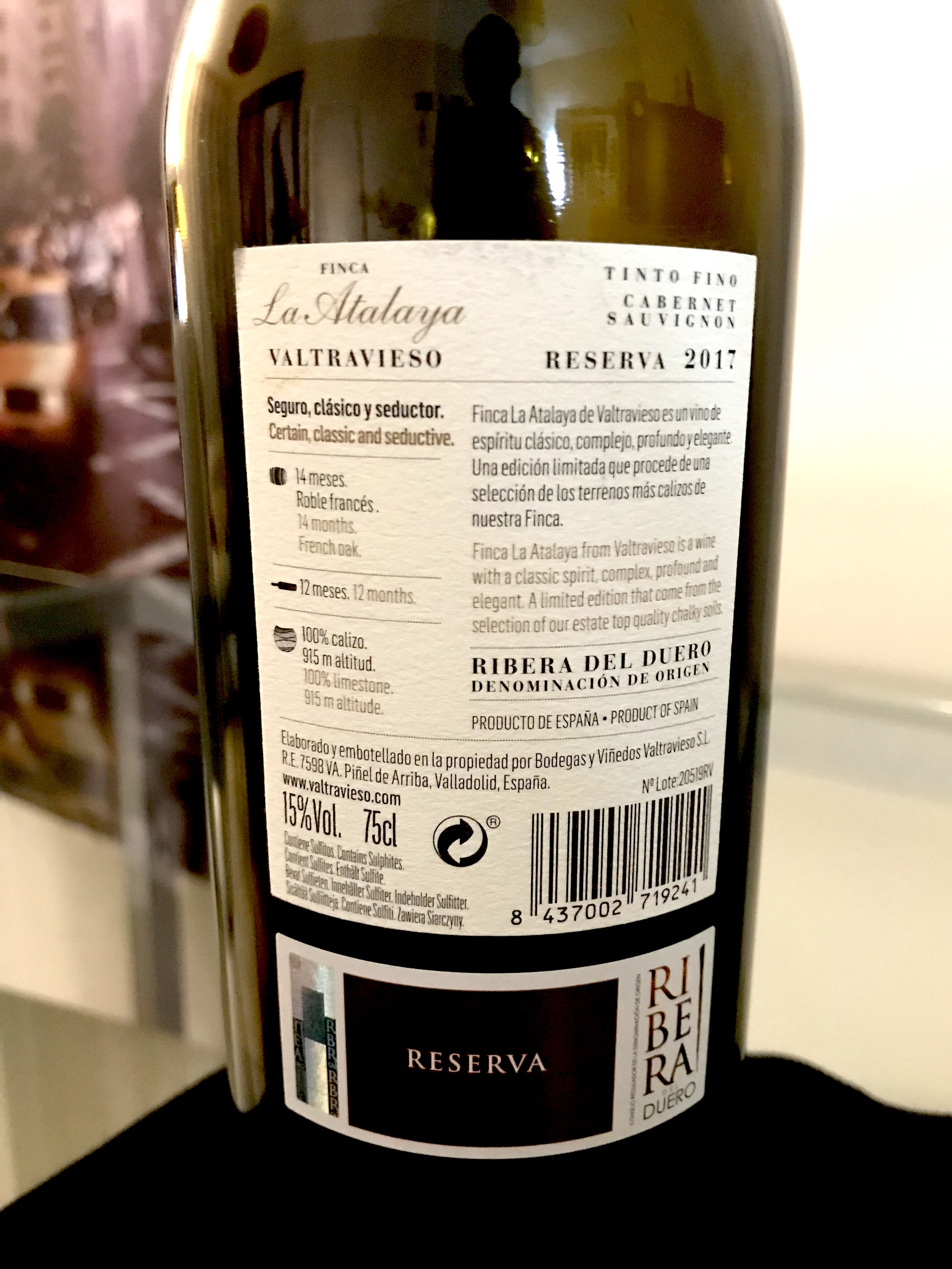 Hoy estamos ante este vino de la D.O. Ribera del Duero, de escasa producción, en nuestro caso botella n°13.020 de 13.282 producidas. Con 15 meses de crianza, y con un impactante 15% de alcohol, a ver qué nos cuenta. Abrimos la botella, esperamos unos 45 minutos y la bajamos a 16°C para su valoración. Tapón fantástico, muy compacto y tintado irregularmente, en general apenas un par de mms desde su base.