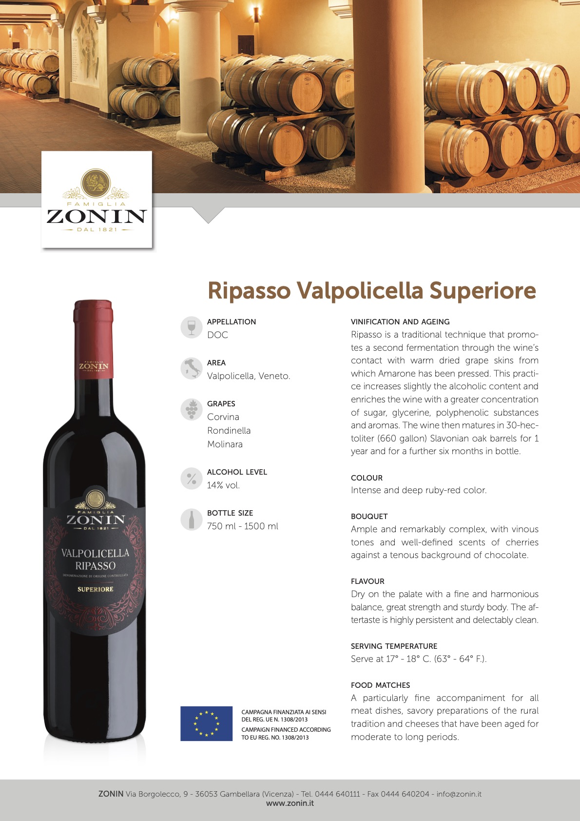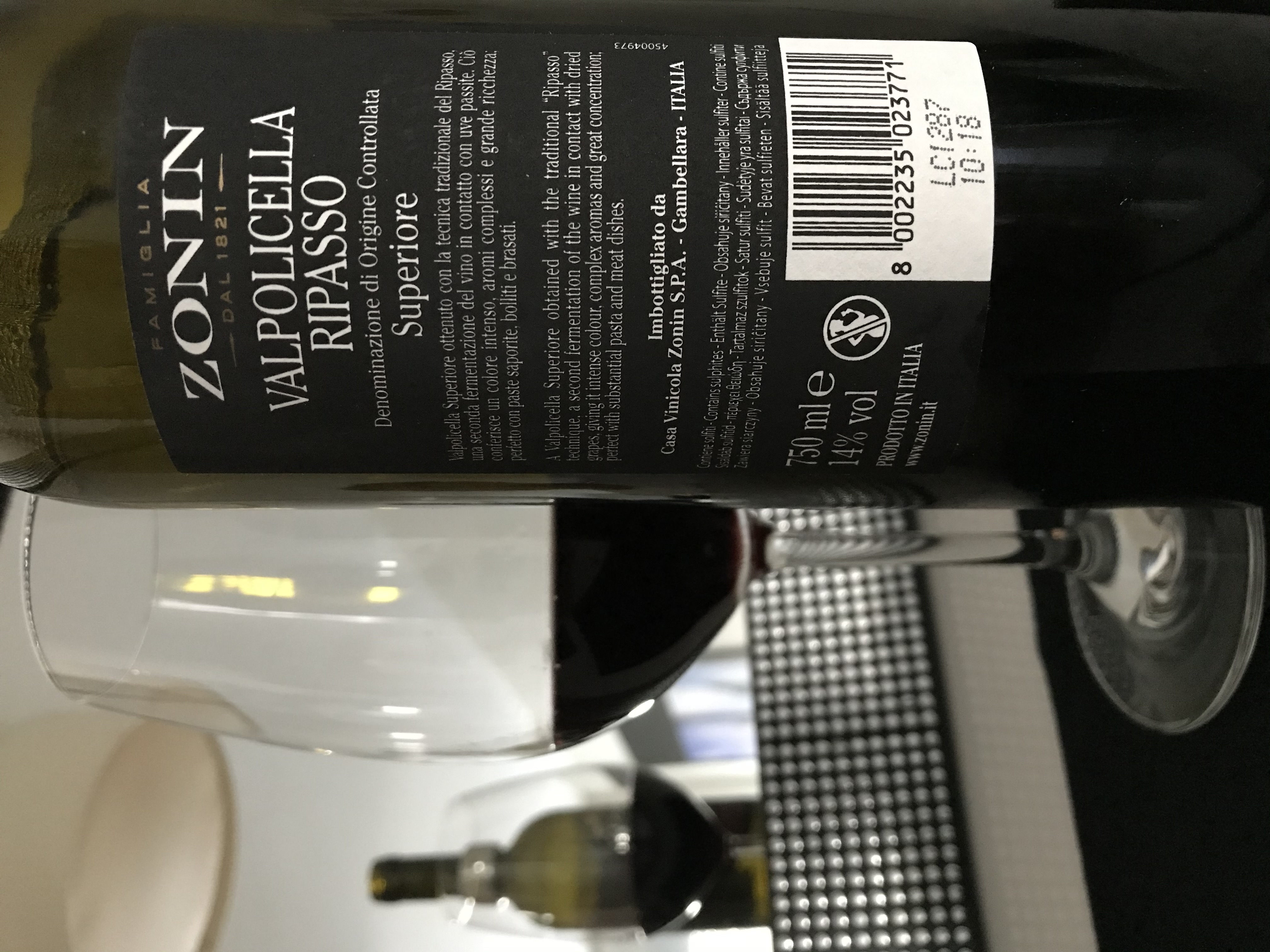 Clásico vino de Valpolicella, con 2ª fermentación del vino junto a las pieles secas de la prensa del Amarone. Granate pálido brillante, con aromas vivos de fruta roja y terciarios. Recuerda a fresa, cereza, cacao, regaliz, madera, brea, monte, bourbon, mucho tabaco. En boca es casi seco, con taninos medios y pulidos, alcohol alto y cuerpo medio+, intenso y con final medio+. Está MB elaborado.