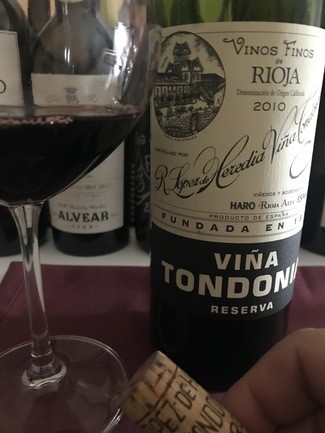 Vamos a abrir un Tondonia 2010, el cual todavía no habíamos probado. Mucha ilusión siempre probar nuevas añadas de estos fabulosos reservas. Viene con una caja cilíndrica metálica muy bonita con una foto muy vintage de la misma botella. Decir que pedimos online un 2009, pero nos llegó este 2010 ): ... sin problemas. Abrimos la botella y dejamos que respirase durante casi 3 horas antes de proceder con su valoración a 17°C. Corcho muy largo, compacto y tintado apenas en su base.