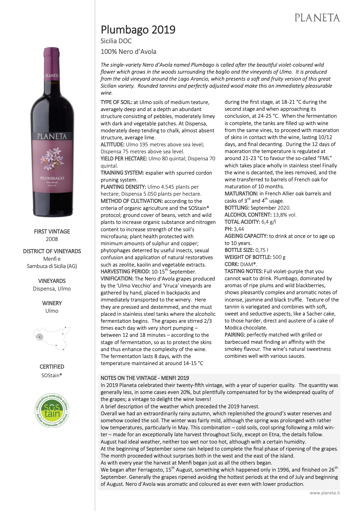 Seco en boca, mineral volcánico, acidez alta, alcohol medio, taninos medios. Sabroso, cereza,mora, ciruela, menta, hierbas de monte, especias picantes, curry.