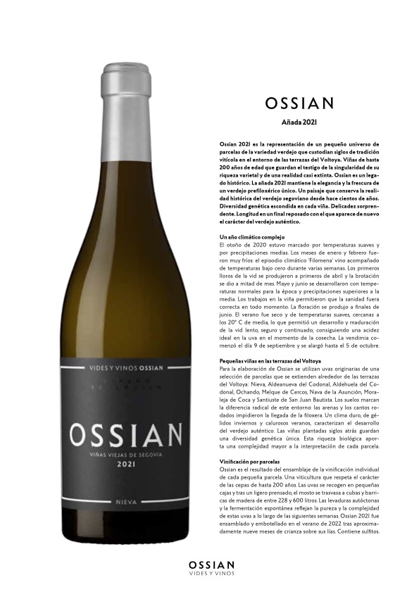Intenso en nariz, fruta blanca madura salpicada de notas cítricas. Hierbas aromáticas, salvia y laurel. Sensación mineral caliza. Conjunto elegante. Notas ahumadas precisas y que llaman al clasicismo. Amplio en boca, tostados especiados, con argumento cítrico y equilibrio general. Llamado a crecer en botella.