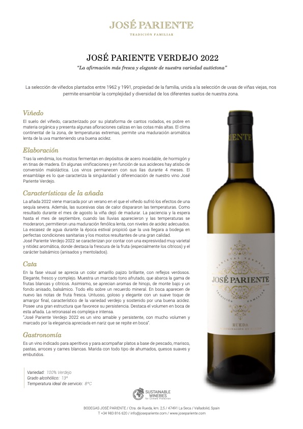 Equilibrio de continentes de Verdejo, con aporte de madera muy sutil, fino, elegante y deja un Verdejo Mimado, sin verdor, suave, con muchas notas florales y de campo silvestre.