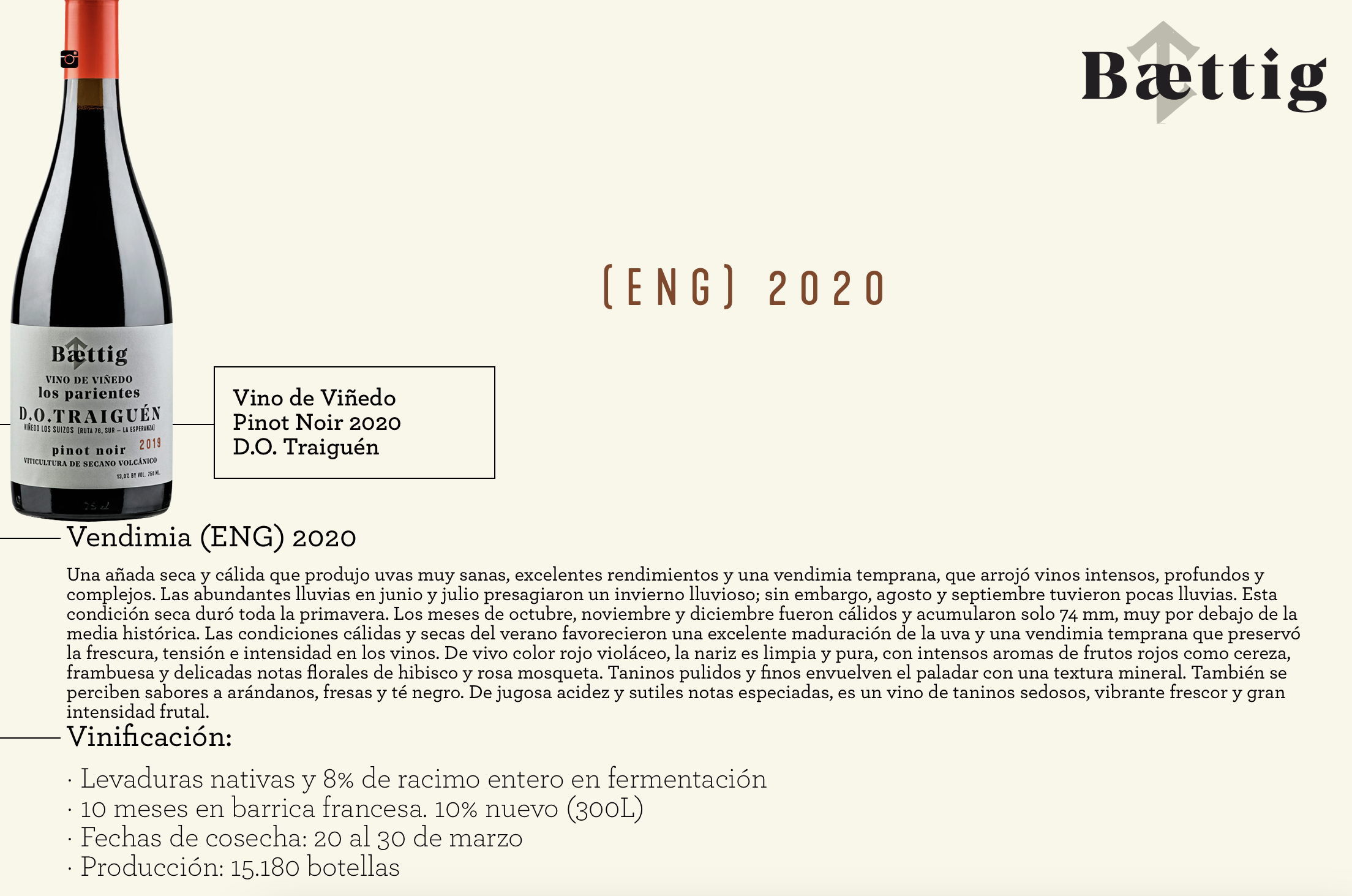 Excelente acidez y calidad de fruta, mineral y jugosa. Cereza, fresa, yogur de fresa, menta, piedra, granito, té negro, un fondo de humo grato ( volcán), nos dice su origen en aromas y en boca.