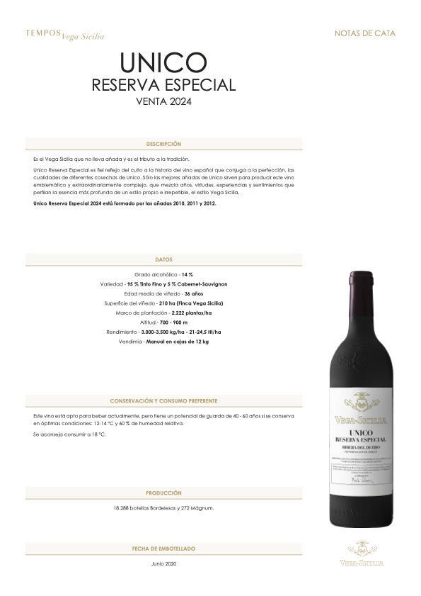 Unico Reserva Especial es fiel reflejo del culto a la historia del vino español que conjuga a la perfección, las cualidades de diferentes cosechas de Unico. Sólo las mejores añadas de Unico sirven para producir este vino emblemático y extraordinariamente complejo, que mezcla años, virtudes, experiencias y sentimientos que perfilan la esencia más profunda de un estilo propio e irrepetible, el estilo Vega Sicilia.
