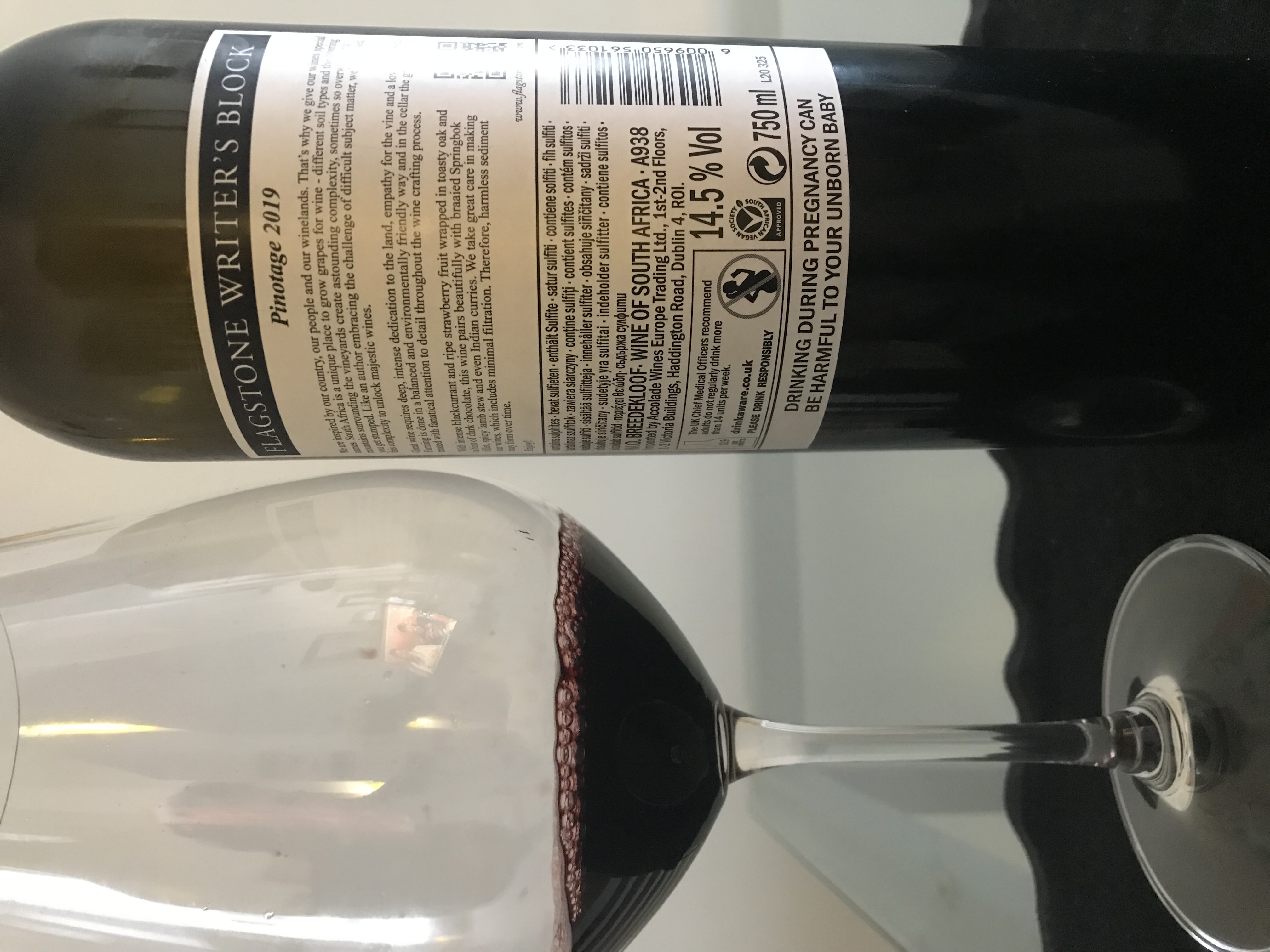 Las uvas de Writer's Block Pinotage - Flagstone provienen de un viñedo ubicado en el punto más alto de las colinas de Waaihoek. Allí la altitud otorga al vino una acidez característica y alta. Los suelos son de granito y pizarra, y las raíces, en su afán por encontrar alimento en las profundidades del suelo, hacen que las plantas sean muy resistentes. Tras la fermentación, permanece 24 meses en barricas de tostado medio.