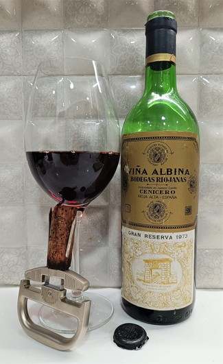 INTRODUCCIÓN: Hoy vamos con un viejuno del 73, 51 años a sus espaldas y entre 4 o 5 años de crianza en barricas. Con un pequeño porcentaje de uva blanca en su coupage, algo muy típico de los viejunos riojanos anteriores a 1980 - 90. Esta añada no la habíamos probado pero de Viña Albina hemos valorado los reservas 64, 71, 75, 82, 05 y 15, y los grandes reservas o viejas reservas 52, 56, 64, 70, 82, y 2001. Así que éste es el primer 73, mucha ilusión, añada "tapada" como tantas veces comentamos. Abrimos la botella y esperamos una hora y 15 minutos antes de proceder con su valoración a 17°C. Corcho abierto con nuestro nuevo abridor Durand, salió sin problemas, una maravilla.