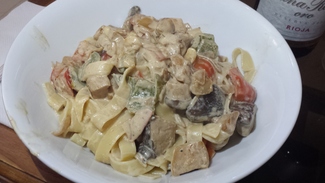 Lo acompañamos de unos "fettuccine" con boletus en masala de cardamomo, cilantro y fenogreco. Una pasta italiana "al dente" exquisita, con aromáticas especias hindúes y un buen tinto español...maridaje globalizado, je,je.